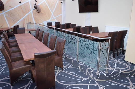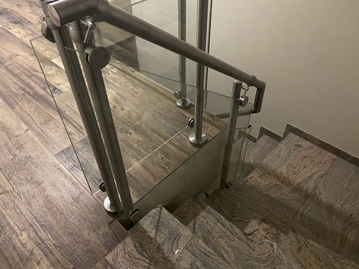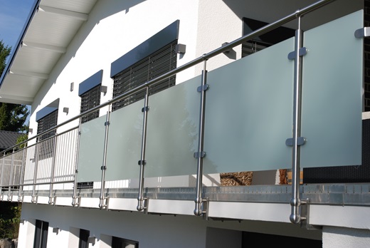 Edelstahlgeländer mit Glaseinsätzen, Glasgravur nach
